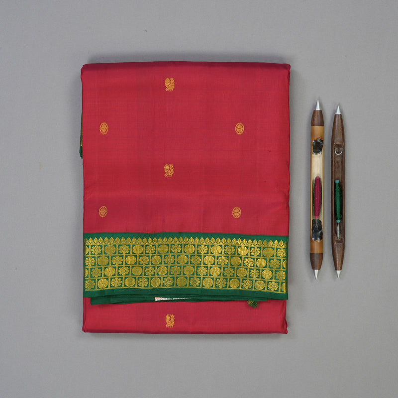 This magnificent Handloom Ten Yards Silk Madisar features a classic maroon body intricately adorned with traditional annam and chakaram motifs. The design is elevated by a striking dark green korvai border, a hallmark of superior handloom craftsmanship that seamlessly joins contrasting colours.