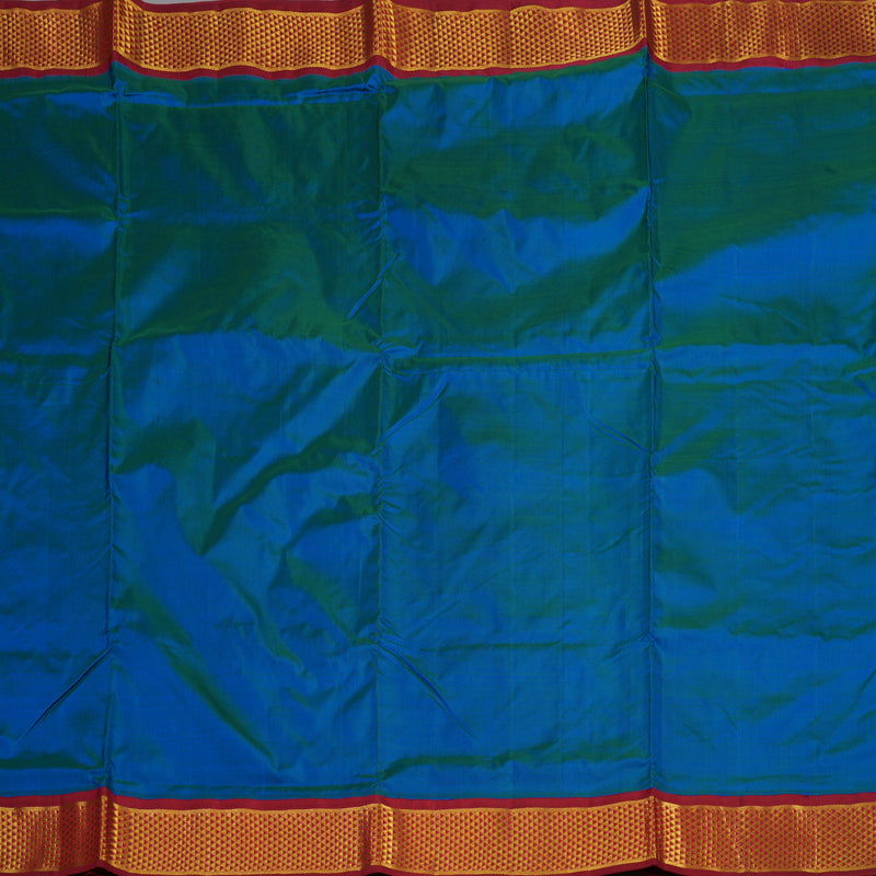 This majestic Handloom Ten Yards Silk Madisar features a stunning mayilkazhuthu body, radiating a deep and iridescent traditional charm. It is distinguished by the heritage "Arai madam" border, a classic weaving pattern that adds a layer of vintage architectural beauty to the drape.
