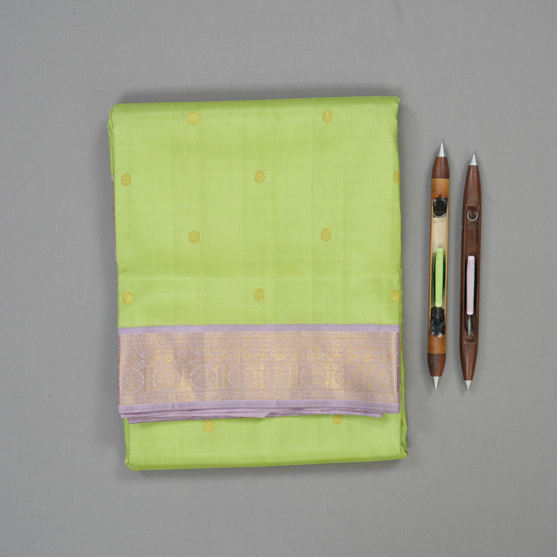 Experience the bridal radiance in this Pista green Handloom Kanjivaram Madisar, featuring a body intricately woven with auspicious chakaram motifs. This masterpiece is framed by a grand border that lends a majestic silhouette to the traditional nine-yard drape, making it an exquisite choice for a bride’s special day.