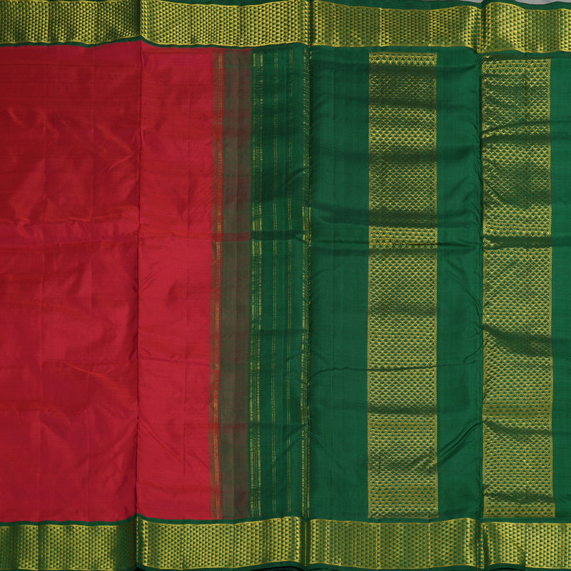 Auspicious red silk madisar saree in the traditional ten-yard format, featuring the elegant arai madam pet border with authentic handloom artistry. A contrasting bottle green pallu adds contemporary sophistication.