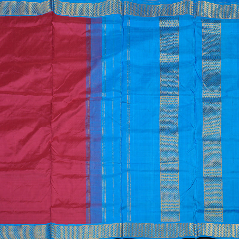Graceful Kanjivaram silk madisar in warm reddish-pink, featuring the traditional arai madam pet border with authentic weaving craftsmanship. The rich ananda blue pallu provides an elegant contrast, creating a harmonious and refined ensemble.