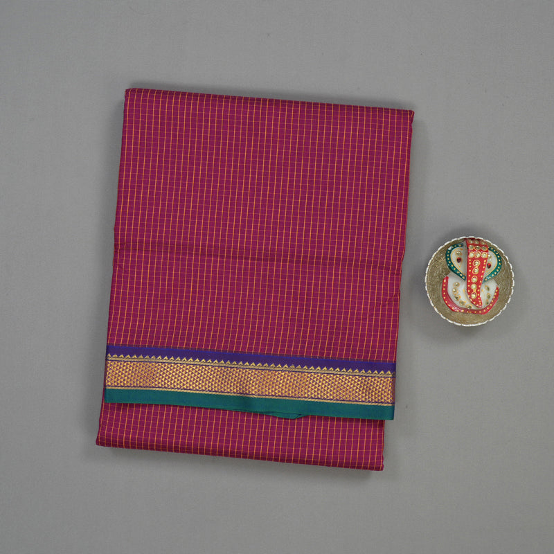 A vibrant, cheerful contrast defines this stunning Magenta Kanjivaram Ten Yards Semi-Silk Saree, framed by a rich Violet Border. This 10-yard semi-silk features subtle checks on the body and the structural arai madam border.
