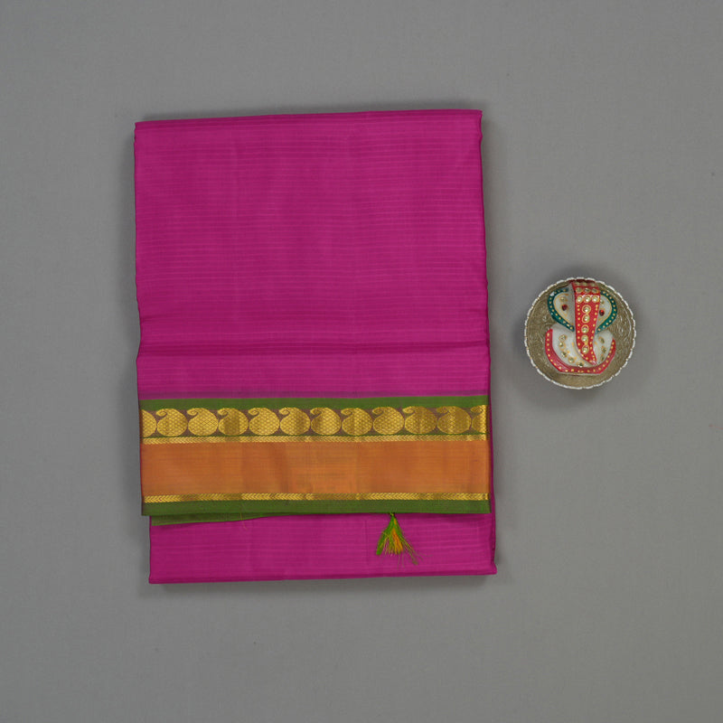 This is a traditional Pure Ten Yards Silk Saree in a vibrant magenta pink that is traditionally draped, often used for temple wear. The color is elegantly contrasted by a manthalir shade and features delicate paisley motifs woven into the border, while subtle, muted thread lines pass through the body for texture.