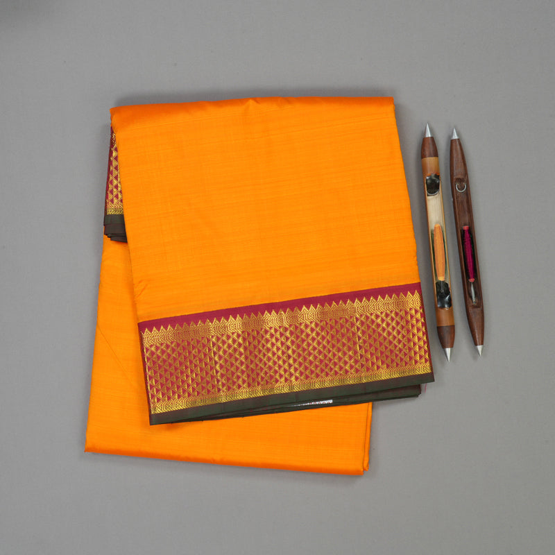 Embrace traditional vibrancy with this Pure ten yards silk saree, featuring a radiant mango orange body. The warm, glowing hue of the silk makes it an exceptional choice for grand weddings and auspicious ceremonies, offering a majestic presence that honours timeless South Indian heritage. Designed for the perfect Madisar drape, this saree combines luxurious comfort with a truly regal silhouette.