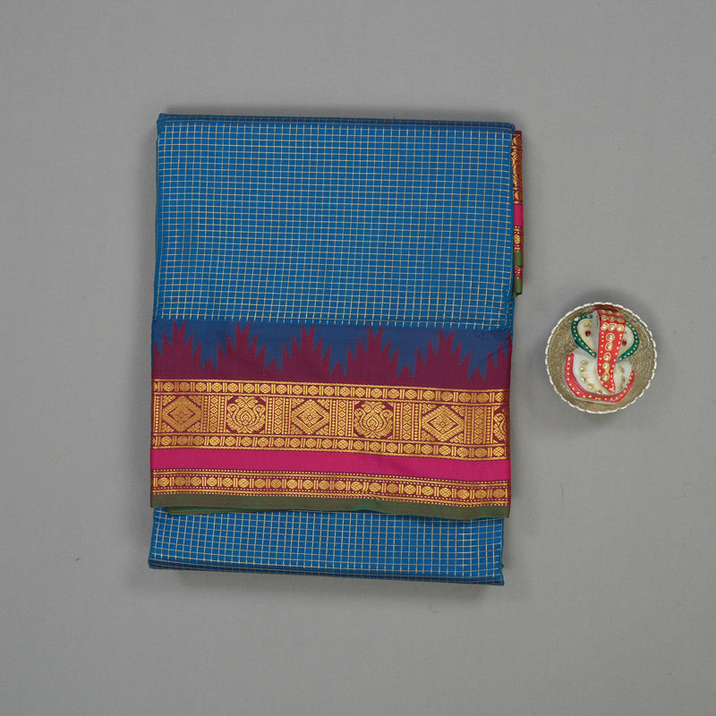 A deep, classic contrast defines this elegant Peacock Blue Kanjivaram Ten Yards Semi-Silk Saree, framed by a rich Kum Kum Maroon Border. This 10-Yards semi-silk features checks across the saree with a traditional border.