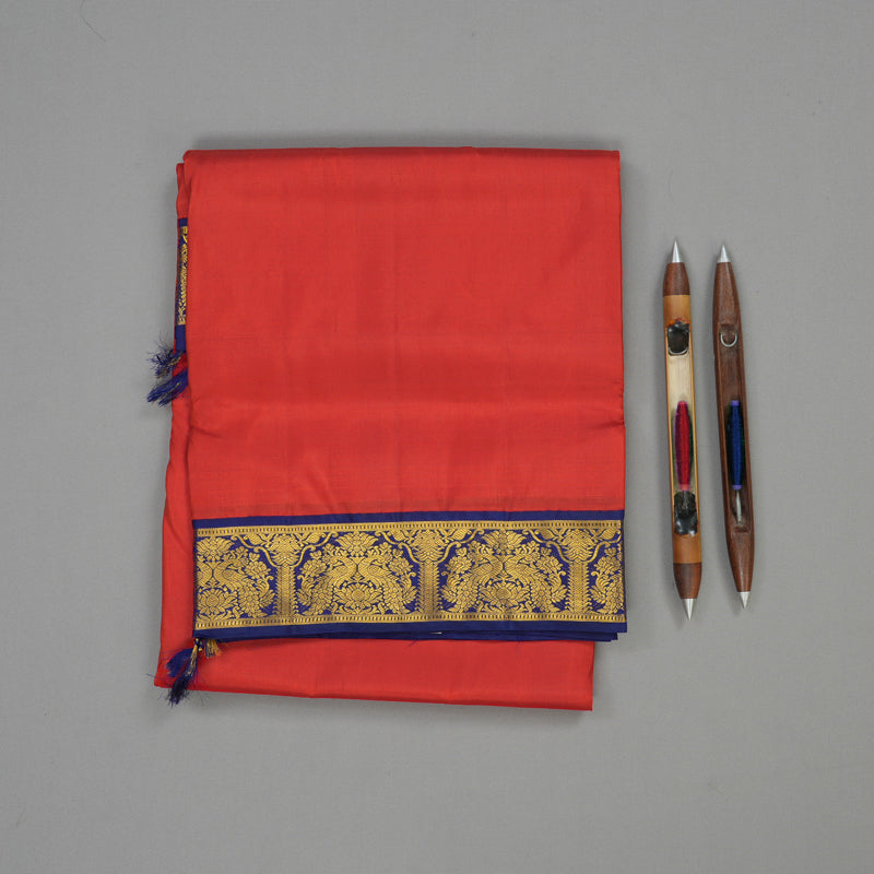 This classic Ten Yards Silk Saree in a traditional red is a beautiful blend of timeless elegance and artistry. The saree is elegantly framed by a deep midnight blue border, which provides a rich and sophisticated contrast. This border is meticulously woven with classic twin peacock motifs, which add a touch of classic elegance and beauty.