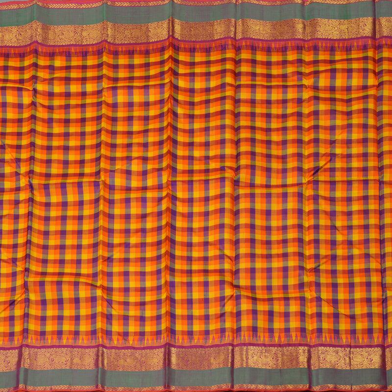 Embrace the nostalgic charm of South Indian heritage with this Handloom Kanjivaram Silk Saree, featuring the iconic and cheerful Paalum Pazhamum checks. This classic multi-colored grid pattern radiates warmth and joy, perfectly paired with a traditional woven border and pallu that showcases the peak of handloom artistry.