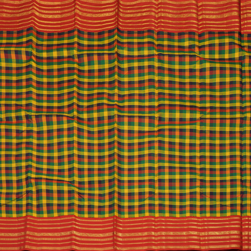 A striking Korvai Contrast Kanjivaram Silk Saree featuring the intricate Paalum Pazhamum checks all over the body, framed by a festive Red Border. This authentic Korvai silk features the Varisapet border meticulously woven with small elements, creating a traditional and opulent look. This is an ideal silk saree for grand festive occasions.
