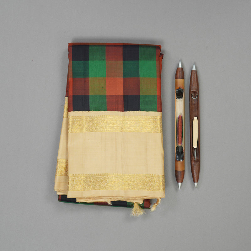 This extraordinary Korvai Contrast Saree is prized for its complex weave, combining traditional checks with a motif-rich Rettapet border. This magnificent Multicolour Checks Saree is priced at ₹21,580, a premium investment in a richly patterned Korvai weave.