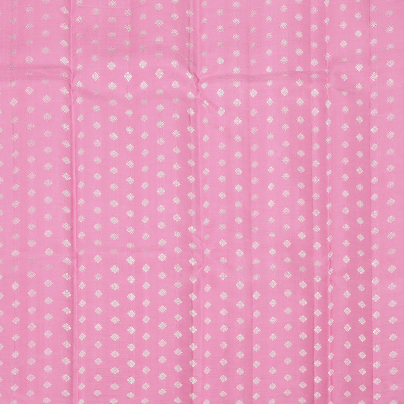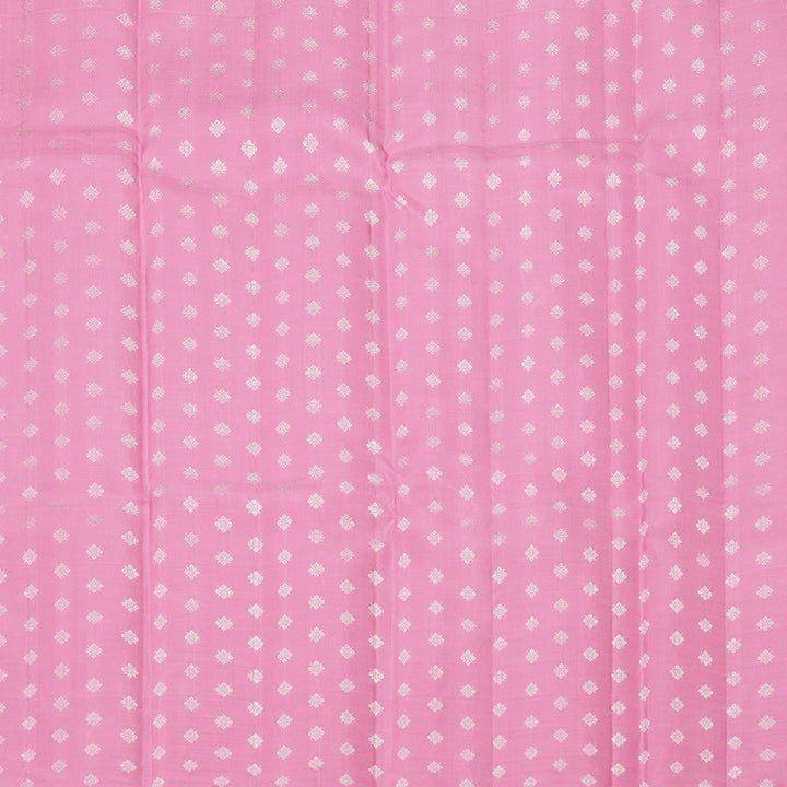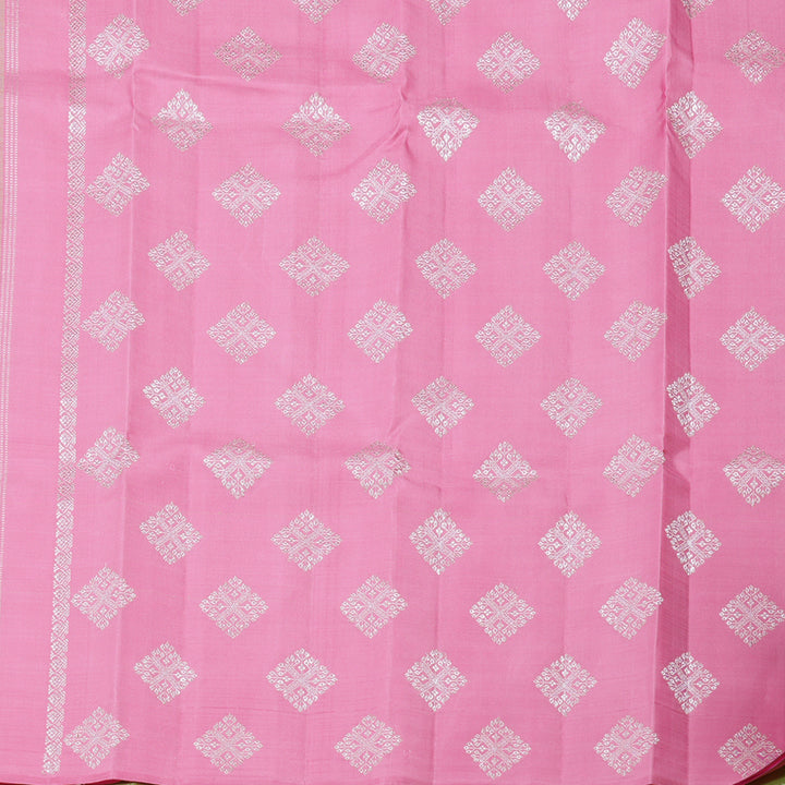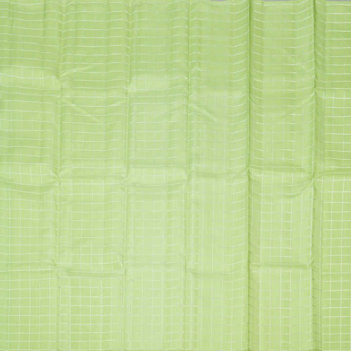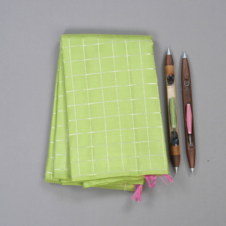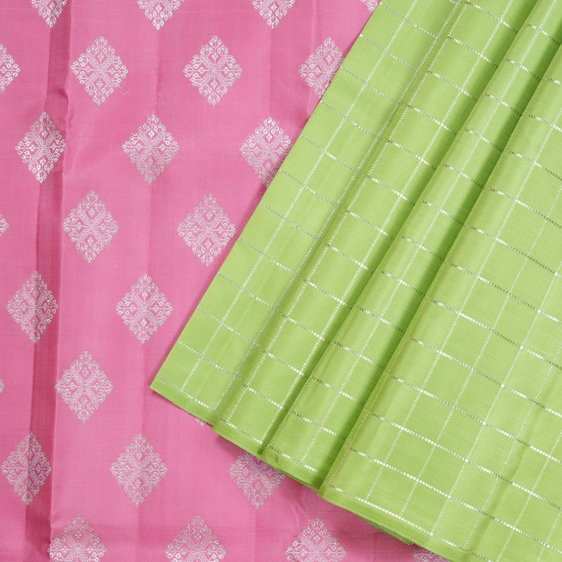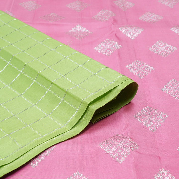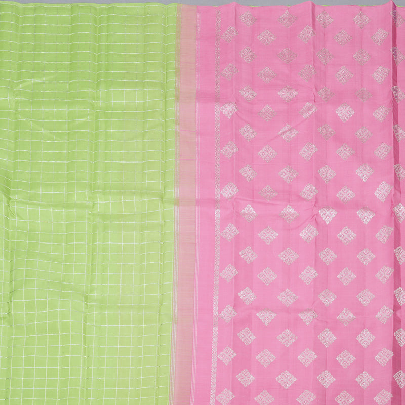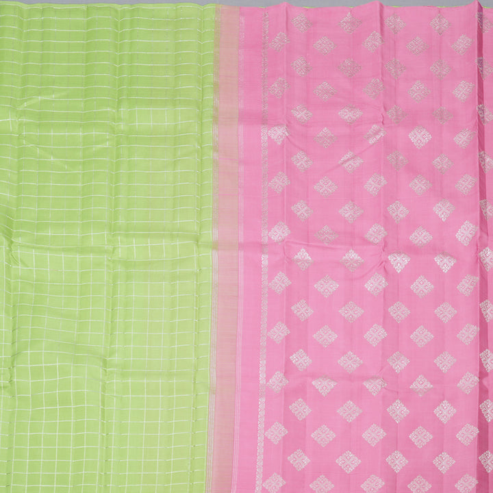 The apple green body, designed with soft silver jari checks, gives off a light, airy charm, making it perfect for daytime celebrations. But the real surprise? The pallu and blouse are in stunning rose pink, adorned with elegant silver motifs, adding a striking contrast that makes this saree truly one of a kind. The absence of a border keeps it modern and minimal, letting the colours and weave do all the talking.