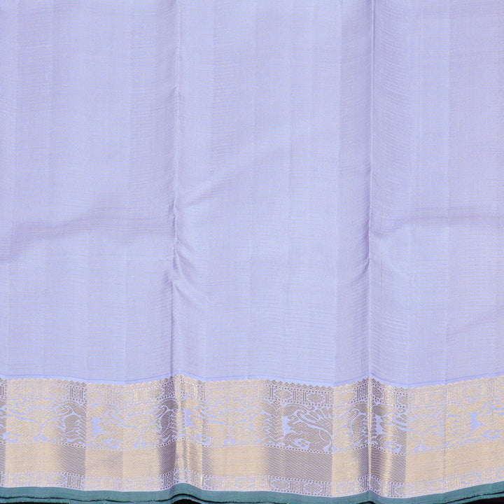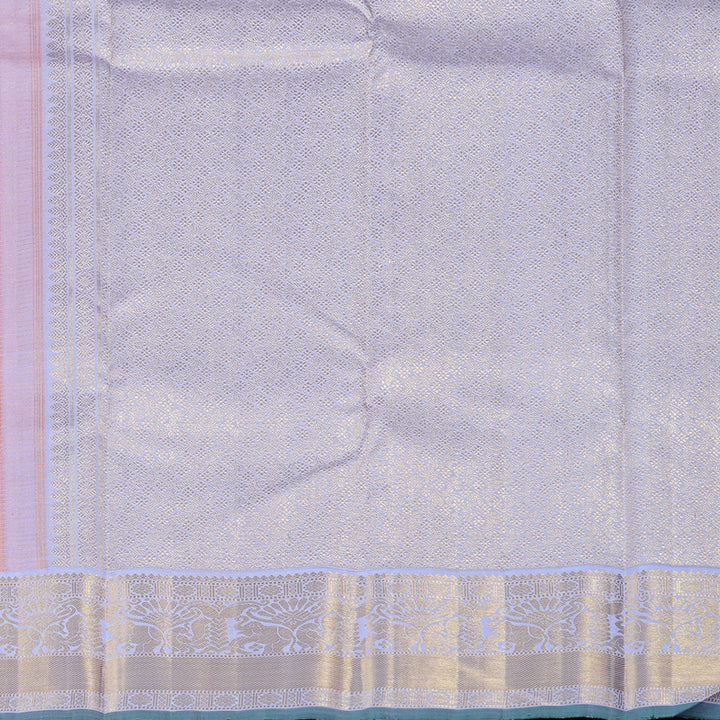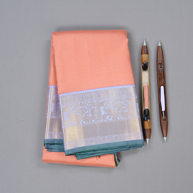 This Kanjivaram silk saree is an absolute head-turner! The peach-pink body feels like a fresh bloom, radiant yet subtle. But what sets it apart is the delicate lavender border and pallu — a combination you don’t see every day.