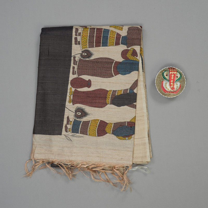 A monochrome, patterned look defines this striking Beige & Black Pure Tussar Saree, finished with a tonal Beige & Black Border. This Pure Tussar Saree features bold tribal prints on the body, ideal for a modern, statement drape.