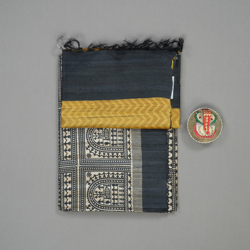A classic, monochromatic look defines this elegant Beige & Black Pure Tussar Saree, framed by a deep Black Border. This natural silk features distinctive tribal art work on the saree, adding a unique, earthy cultural feel. This is an ideal pure tussar silk for sophisticated, artistic wear.