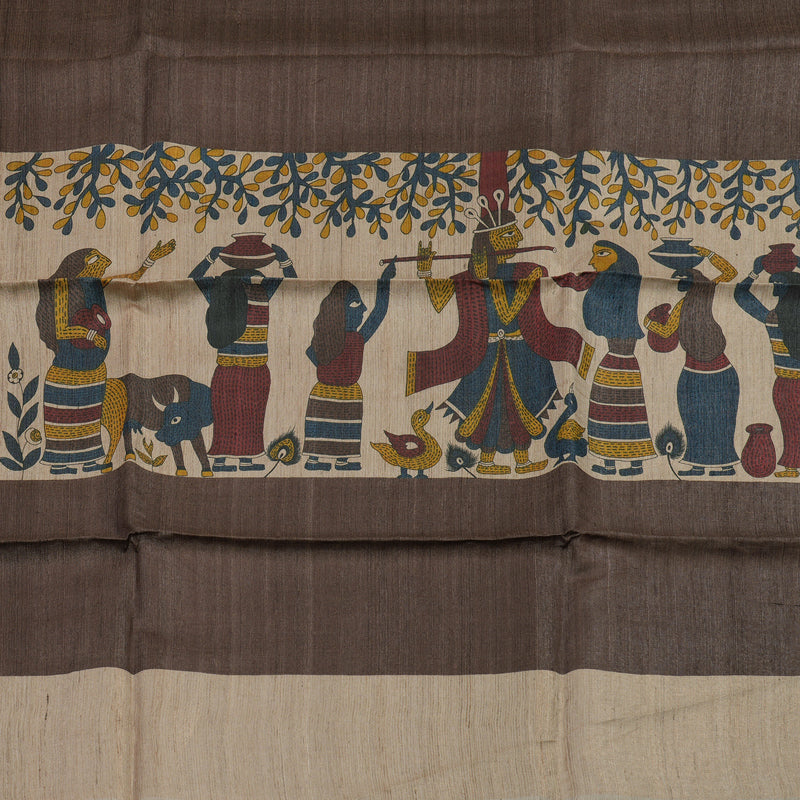 An earthy, soft contrast defines this elegant Brown Pure Tussar Saree, framed by a delicate Beige Border. This Pure Tussar Saree features rich Krishnan in Vrindavan prints on the saree, offering a beautiful, idyllic art scene.