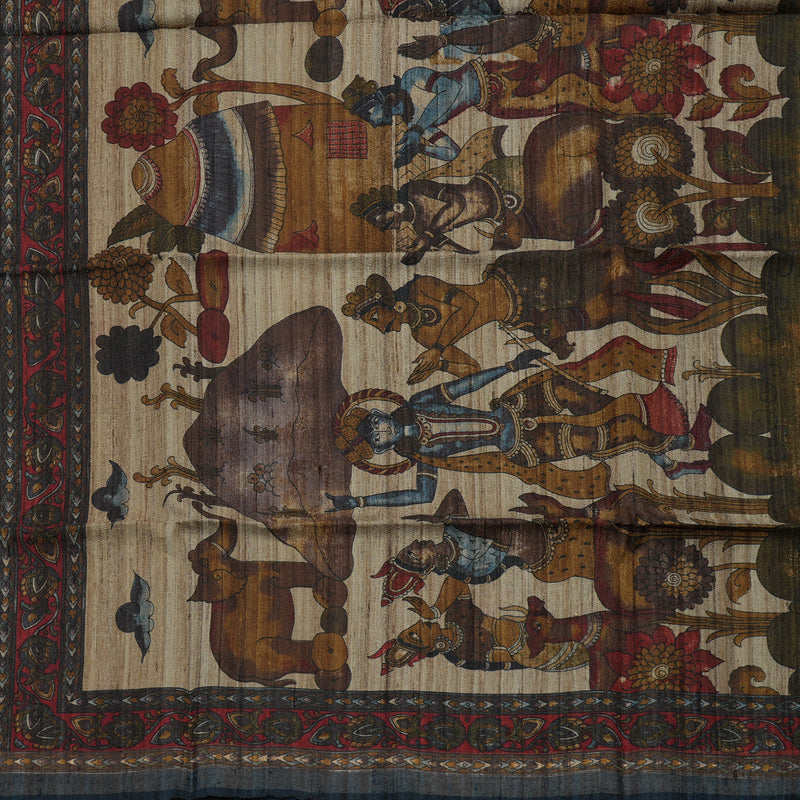 A deep, classic look defines this elegant Dark Blue Pure Tussar Saree. This natural silk features exquisite Krishnan images on the thalappu (pallu), adding a distinctive, artistic touch to the drape. This is an ideal pure tussar silk for formal evening wear and cultural events.