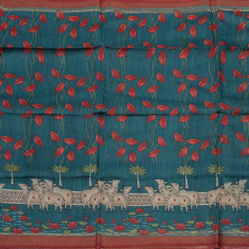 A deep, striking contrast defines this elegant Peacock Green Pure Tussar Saree, framed by a classic Maroon Border. This Pure Tussar Saree features traditional pichwai prints on the body, adding rich folk art detailing.