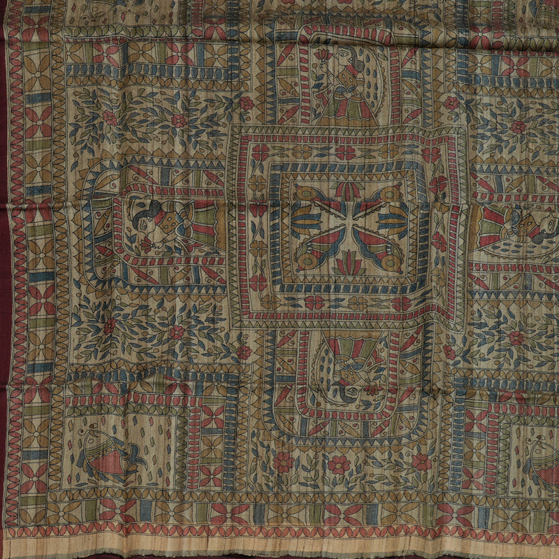 Embrace sophisticated style with this hand-printed pure tussar saree in rich wine, featuring intricate patterns that grace both the blouse and pallu. The detailed embellishments add depth and visual interest while maintaining an effortless aesthetic perfect for casual occasions.