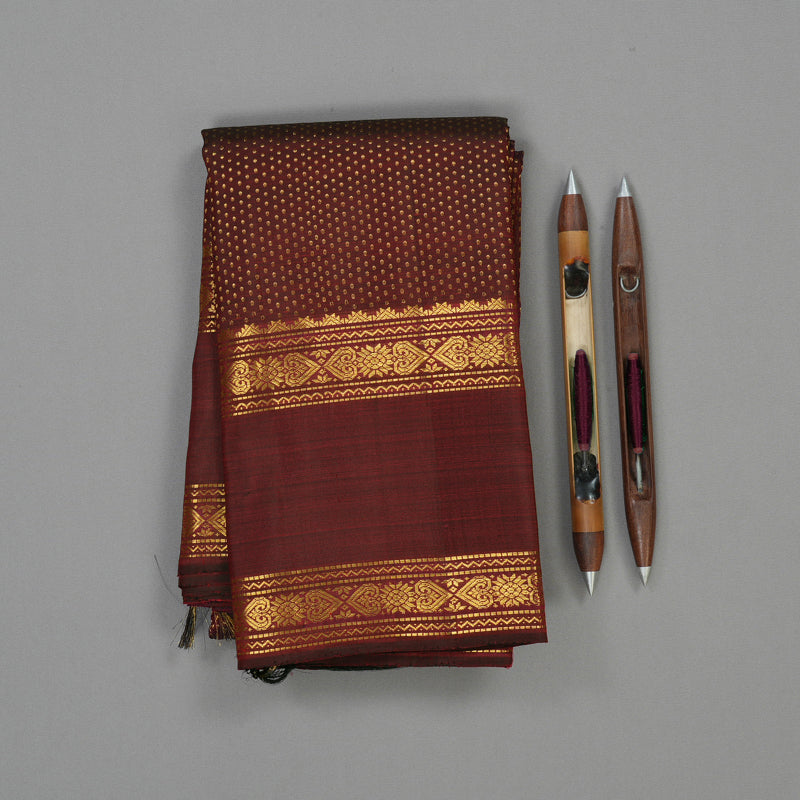 Embrace the divine charm of this Araku maroon Handloom Kanjivaram silk saree, a true masterpiece of traditional weaving. This monotoned silk saree radiates a deep, uniform glow, featuring the iconic laksham butta intricately woven across the body to represent prosperity and abundance.