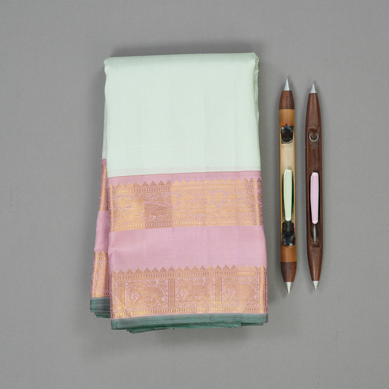 Step into the world of contemporary elegance with this light pista green Handloom Kanjivaram silk saree, a standout piece for the "Go Pastels" Kanjivaram trend. This saree is masterfully crafted using the korvai contrast technique and features a classic rettapet border, which is richly detailed with traditional elephants, peacocks, and rudraksham motifs on both pettu.