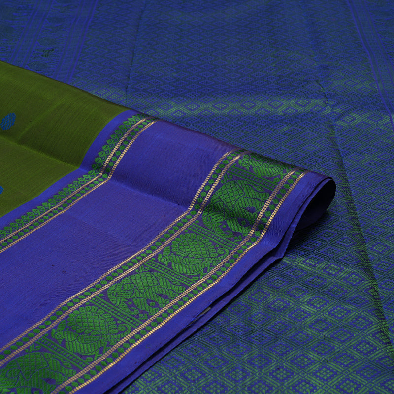 Embrace a sophisticated blend of textures in this mehandi green Handloom Kanjivaram silk saree, featuring delicate thread buttas across the body. The design is framed by a masterful border that combines thread and jari work, intricately woven with regal elephant and peacock motifs.