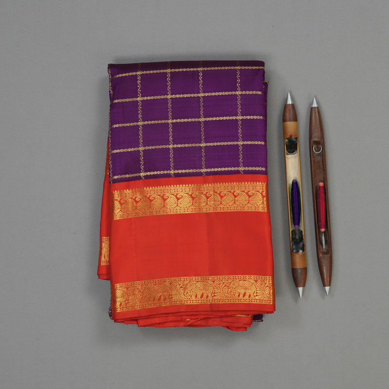 The body is patterned with Jari Kattam (checks), while the border features the Retta Pet weave, richly decorated with paisley and chakram motifs. This saree is an investment piece, offering deep colour and complex pattern. Priced at ₹28,820.