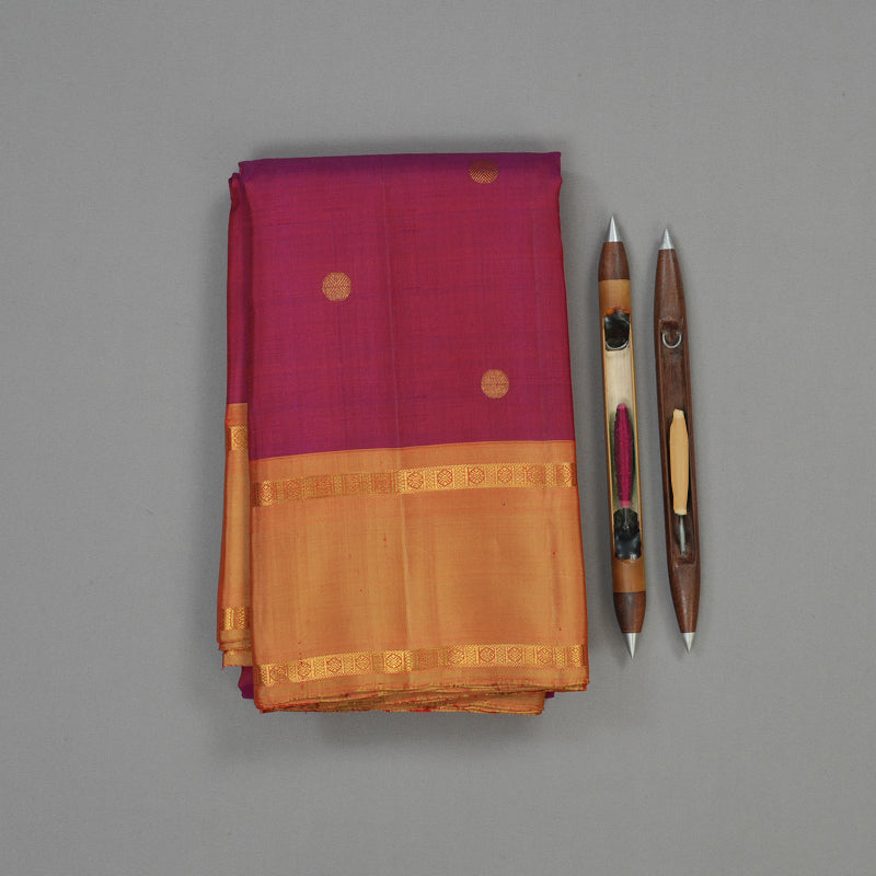This rich Wine Vintage Kanjivaram Silk Saree is a striking pure silk piece, achieving a vibrant contrast with a cheerful Golden Yellow Border. The deep primary colour makes this an ideal choice for grand occasions.