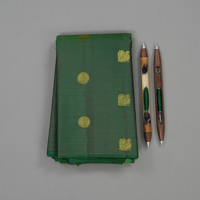 Exude a sophisticated charm in this dark green Handloom Kanjivaram silk saree, a perfect blend of tradition and modern minimalism. The body is exquisitely detailed with shimmering vairaoosi lines and divine annam chakaram motifs, creating a rich, textured appearance. This unique borderless design allows the focus to remain on the fluid drape and intricate body patterns.