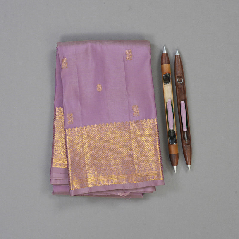 This Handloom Kanjivaram features a dreamy lavender body adorned with traditional annam and chakaram motifs. The delicate bird and wheel patterns are woven with precision, lending a classic heritage feel to the modern, soothing pastel hue.