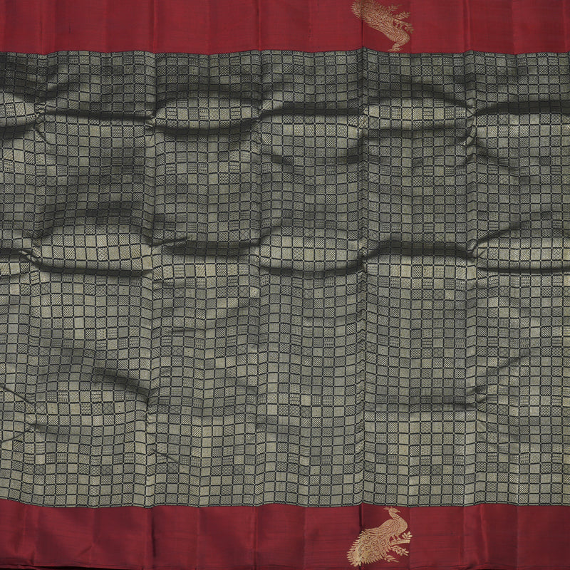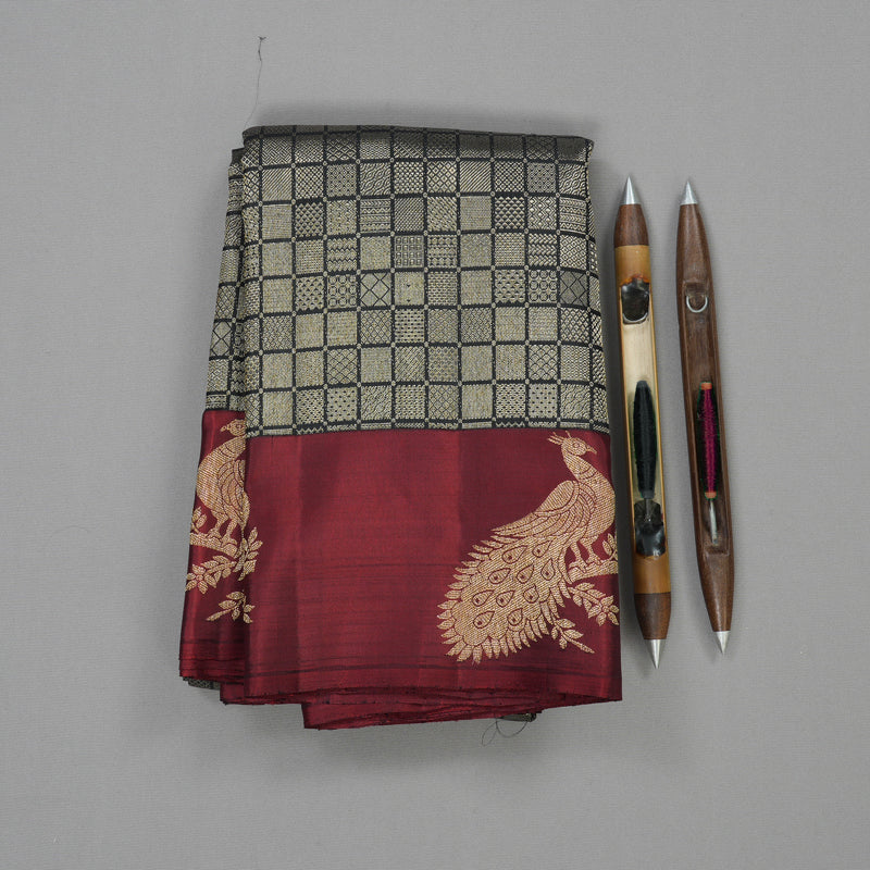 Bold and striking, this black and wine maroon Kanjivaram silk saree is made to make a statement rooted in tradition. The black body features a stunning grid-like design made entirely of gold zari, each square filled with varied textures, florals, checks, waves, and paisleys, showcasing the weaver’s craft with finesse.