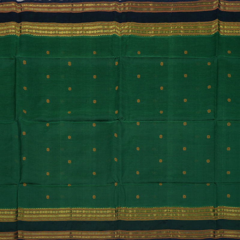 A deep, tonal look defines this classic Bottle Green Pure Silk Cotton Saree, framed by a deep Deep Peacock Green Border. This saree features small floral buttas on the body.