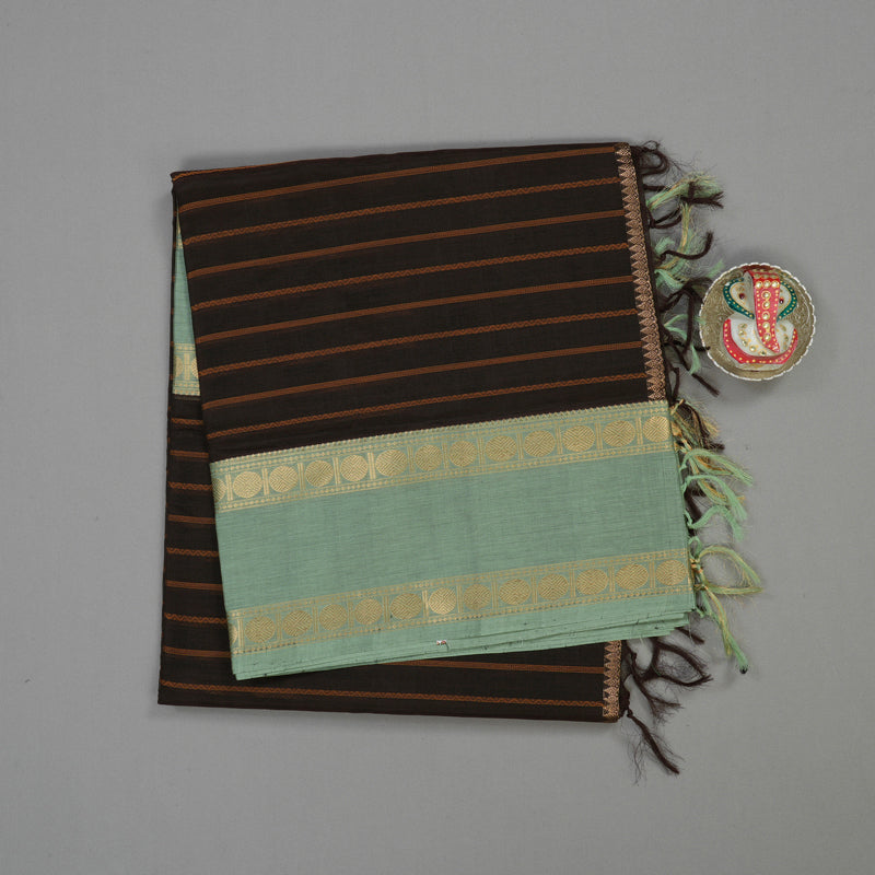 A supremely comfortable soft Kanchi silk cotton saree in a distinctive Paaku colour (Betel Nut), which is a unique and rich earthy shade. The body is elegantly woven with Veldhari thread lines (fine, subtle striped or wavy patterns), giving it a delicate texture and classic look. It is framed by a traditional Rettapet border (double border) in a contrasting light pista green for a refreshing color pop.