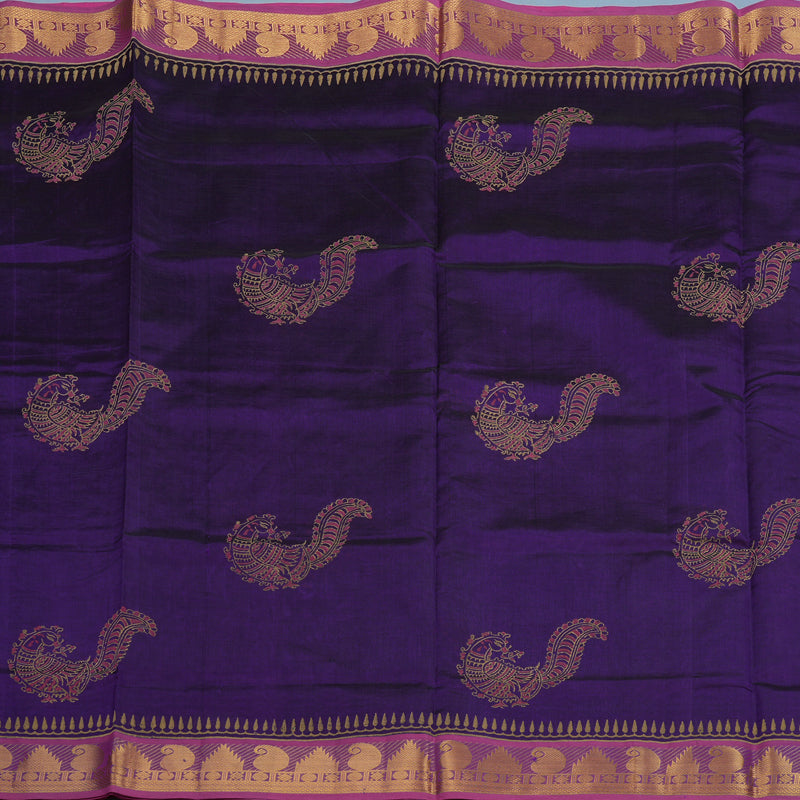 This regal Pure printed silk cotton saree features a majestic purple body adorned with intricate peacock prints, strikingly paired with a vibrant rani pink pallu and blouse.