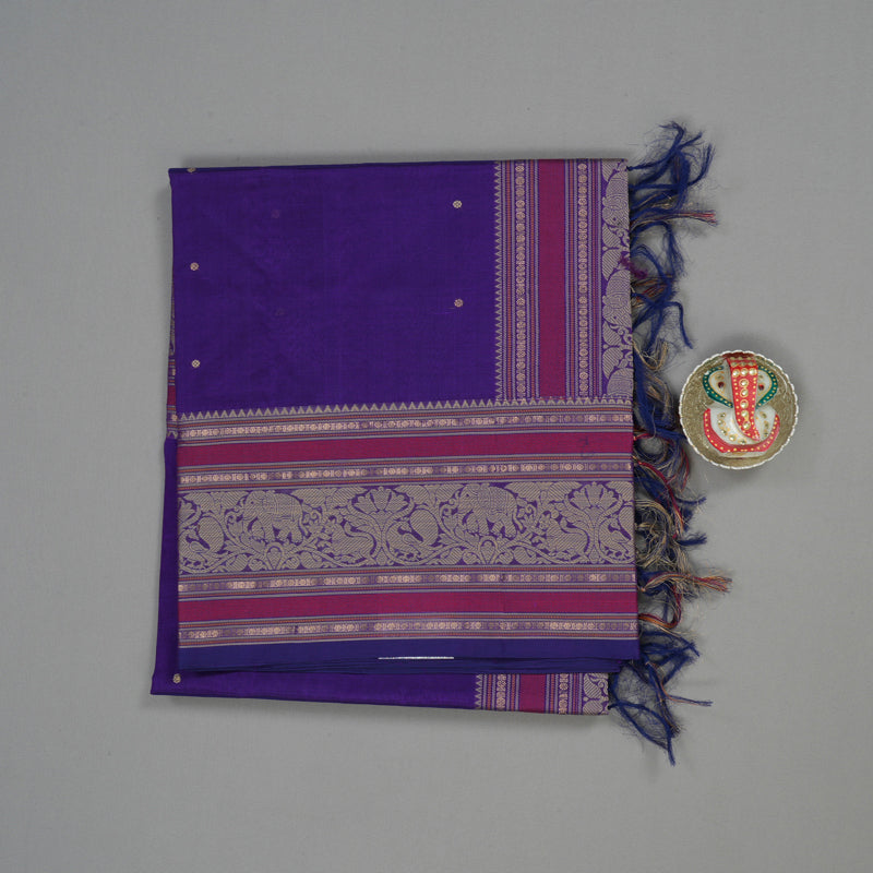 This beautiful Kanchi Silk Cotton Saree is valued for its rich colour and the blend of subtle buttas with the strong elephant border. This magnificent Purplish Blue Saree is priced at ₹7,560.