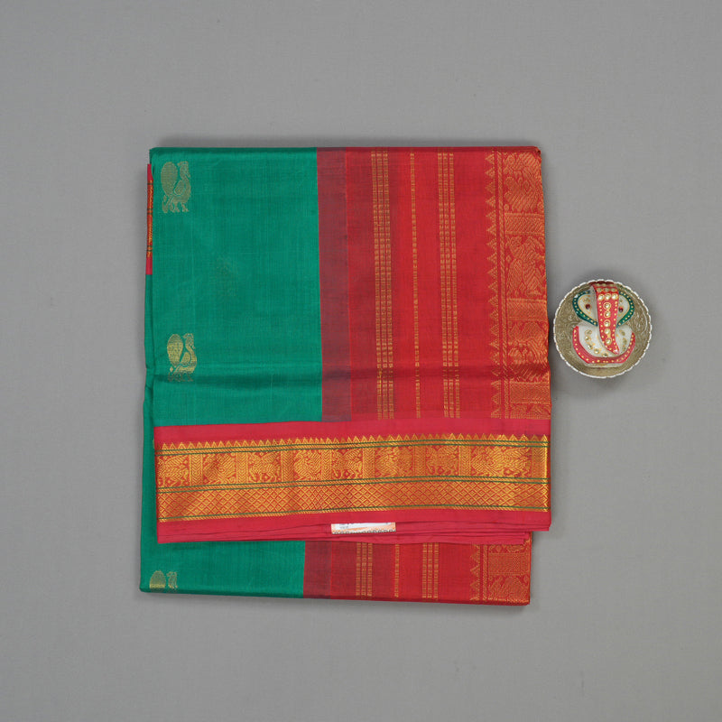 This stunning pure Silk Cotton Saree captures a captivating contrast between its soothing Sea Green body and a vibrant Red border, blouse, and pallu. The elegant peacock motif is prominently featured, woven gracefully throughout the entire saree body, symbolizing beauty and grace. The border itself is richly adorned with traditional designs, including the powerful horse and the graceful peacock motifs. This comfortable and traditional piece perfectly balances a cool, unique body color with an auspicious, bold contrast for a truly memorable look.