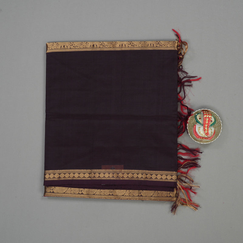 A deep, classic look defines this traditional Wine Maroon Pure Kanchi Silk Cotton Saree, framed by a rich Paaku (Areca Nut) Border. This comfortable Silk Cotton Saree features dots inside the checks of the saree and the border has commanding elephant motifs.