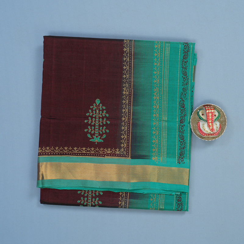 This sophisticated Pure printed silk cotton saree features a rich wine maroon body adorned with elegant prints, beautifully offset by a refreshing sea green pallu and blouse.