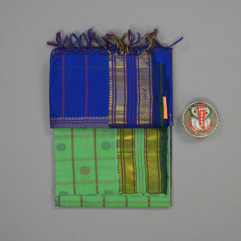 A vibrant, cheerful look defines this classic Yellowish Green Pure Silk Cotton Saree. This saree features mayil and chakram motifs on the body inside checks.