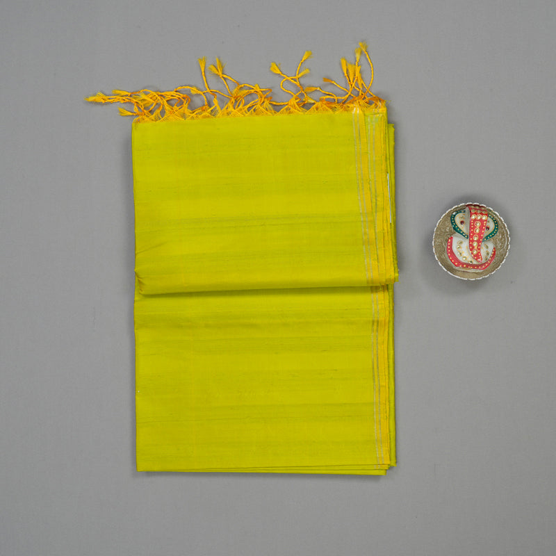 Make a bold yet sophisticated statement with this striking fluorescent green pure soft silk saree. Designed with a contemporary borderless finish, it offers a clean and fluid silhouette that highlights the vibrant glow of the silk.