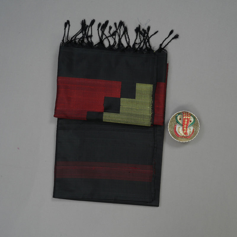 Make a classic, commanding statement with this Handloom Black Pure Soft Silk Saree. The body features a subtle stripe pattern, which provides a delicate vertical texture and a beautiful shimmer to the dark hue. The unadorned design emphasizes the richness and quality of the silk.