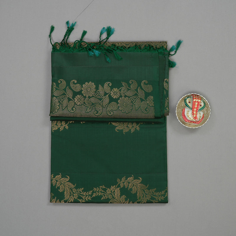 Step into the classic, deep tone of this Bottle Green Pure Soft Silk Saree. The body features delicate floral veins, providing a subtle texture to the rich colour.