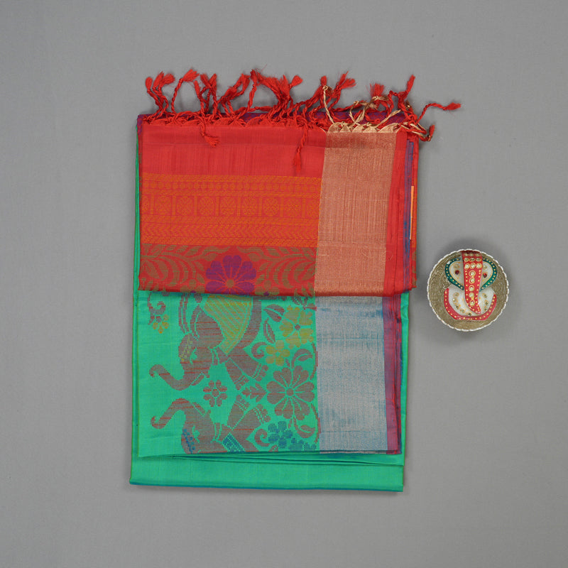 A fresh, vibrant look defines this cheerful Dual Tone (Green & Yellow) Kanjivaram Soft Silk Saree, framed by a delicate Tissue Border. This comfortable soft silk features auspicious elephant and floral prints near the border. This is an ideal everyday silk for a bright, high-impact drape.