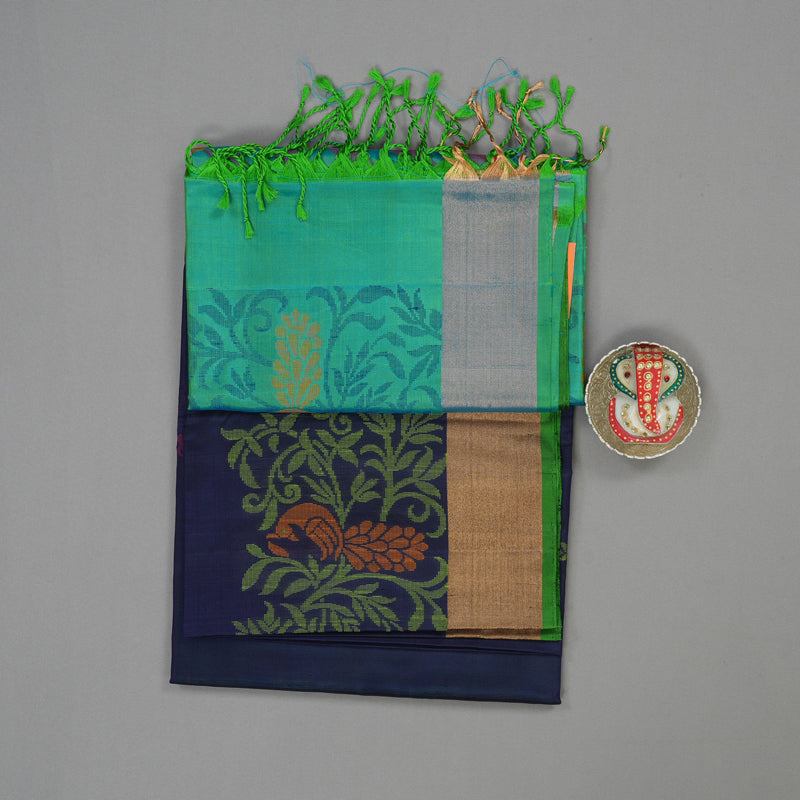 A deep, classic look defines this elegant Navy Blue Kanjivaram Soft Silk Saree, framed by a delicate Tissue Border. This comfortable soft silk features auspicious elephant and floral prints near the border. This is an ideal everyday silk for formal evening wear.