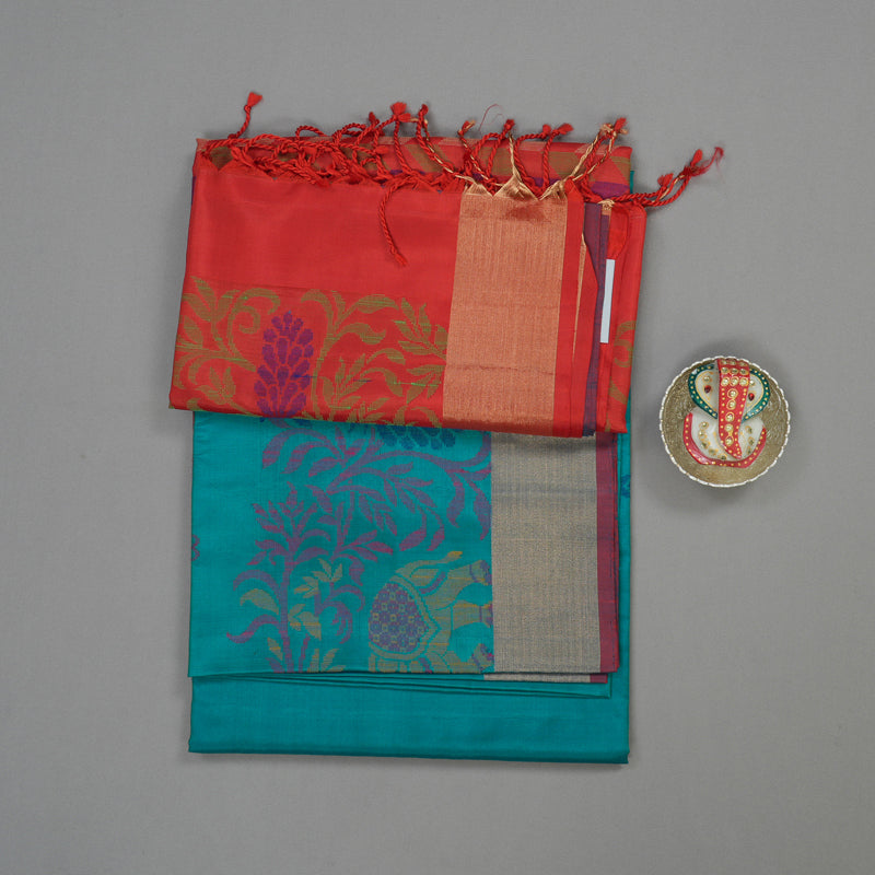Step into the classic festive pairing of this vibrant Rama Green Soft Silk Saree, beautifully contrasted with a traditional Red Border. The border is intricately patterned with an elephant and floral pattern, adding a rich layer of traditional iconography to the cheerful body colour.