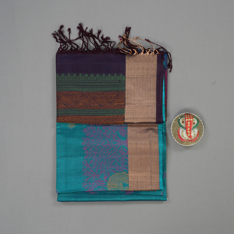 A deep, regal look defines this elegant Sapphire Blue Kanjivaram Soft Silk Saree, framed by a delicate Tissue Border. This comfortable soft silk features auspicious elephant and floral prints near the border. This is an ideal everyday silk for formal sophistication.