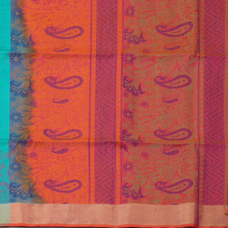 A vibrant, serene look defines this beautiful Turquoise Kanjivaram Soft Silk Saree, framed by a delicate Tissue Border. This comfortable soft silk features elegant paisley prints near the border. This is an ideal everyday silk for a bright, patterned drape.