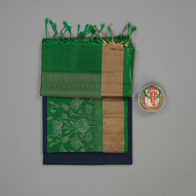 This sophisticated navy blue Pure Soft Silk saree features a classic morning-evening border with intricate motifs, lending it a timeless and regal appeal. Complemented by a vibrant green pallu and blouse and a rich woven pallu that exudes luxury, this stunning drape is perfect for any grand occasion, priced at Rs.10240.