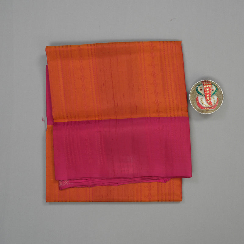 A vibrant, striking contrast defines this cheerful Orange Pure Soft Silk Saree, framed by a bright Pink Border. This Soft Silk Saree features a stylish pattern on the body.