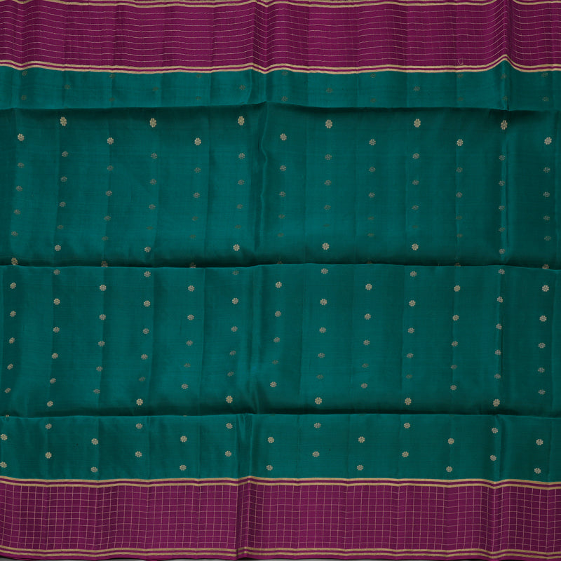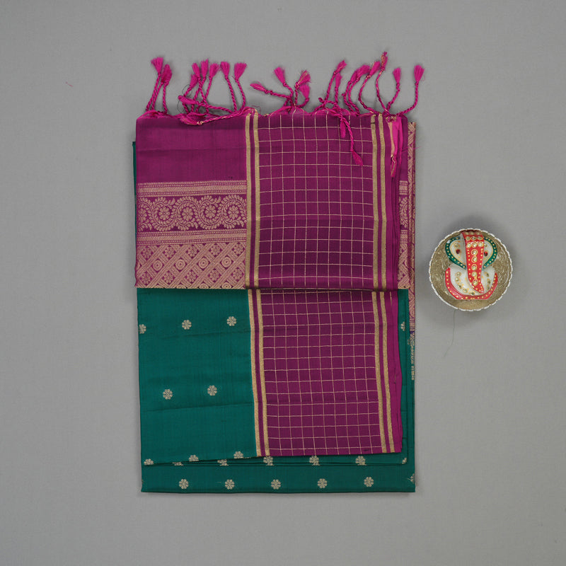 This stunning peacock green Pure Soft Silk saree features delicate flower butta on the body, beautifully framed by a violet contrast border with jari checks. With its attractive colour combination and a rich woven pallu, this elegant drape is a versatile choice for temple events and casual occasion wear, priced at Rs.7010.