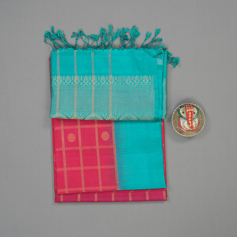 This vibrant Pure Soft Silk Saree features a lovely pink body with jari checks paired with a striking turquoise blue contrast. Finished with a richly woven pallu, this radiant drape is an excellent choice for casual occasion wear.