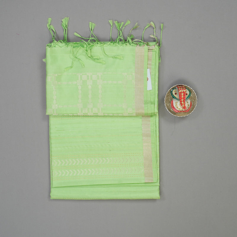This refreshing pista green Pure Soft Silk saree is a stunning, bright monotoned masterpiece that exudes timeless elegance. Featuring classy weaving throughout and a delicate, small one-inch tissue border, this sophisticated drape offers a seamless blend of luxury and subtlety, making it a perfect addition to your wardrobe for Rs. 11080.